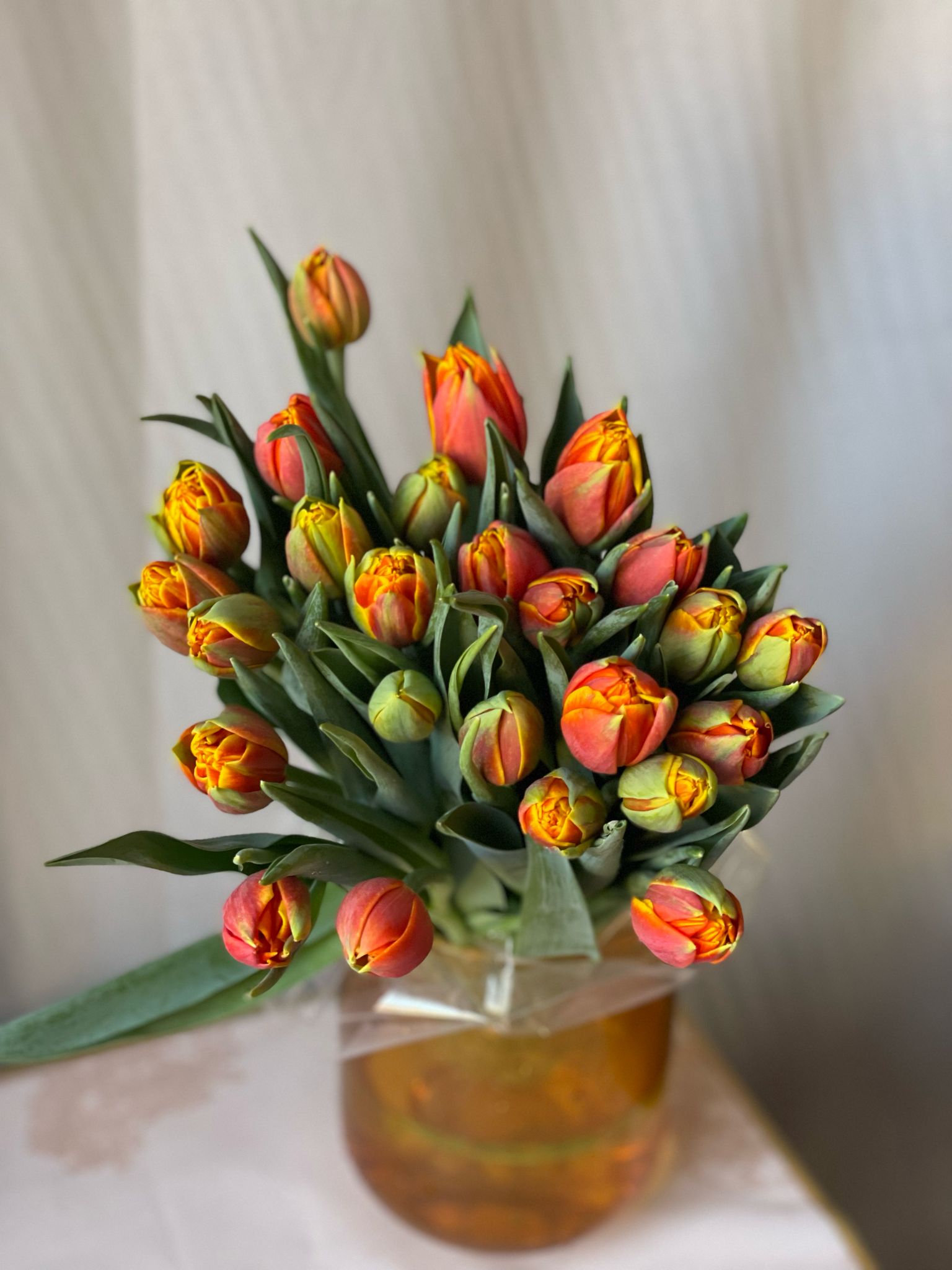Букет будет составлен в соответствии с показанным на изображении стилем и цветовой гаммой. Если конкретные цветы не будут доступны, флорист заменит их на эквивалентные, сохранив общий вид и настроение букета.