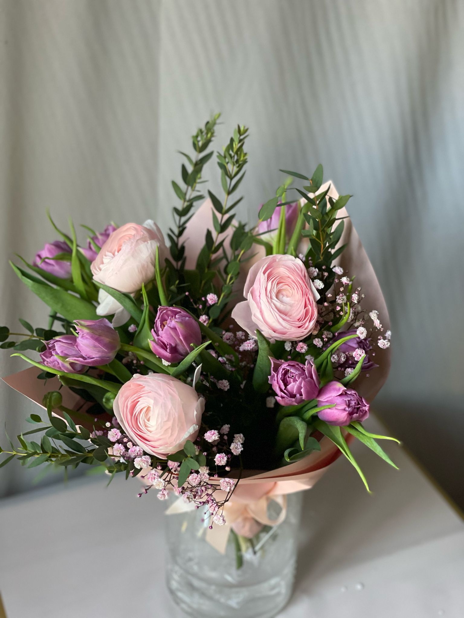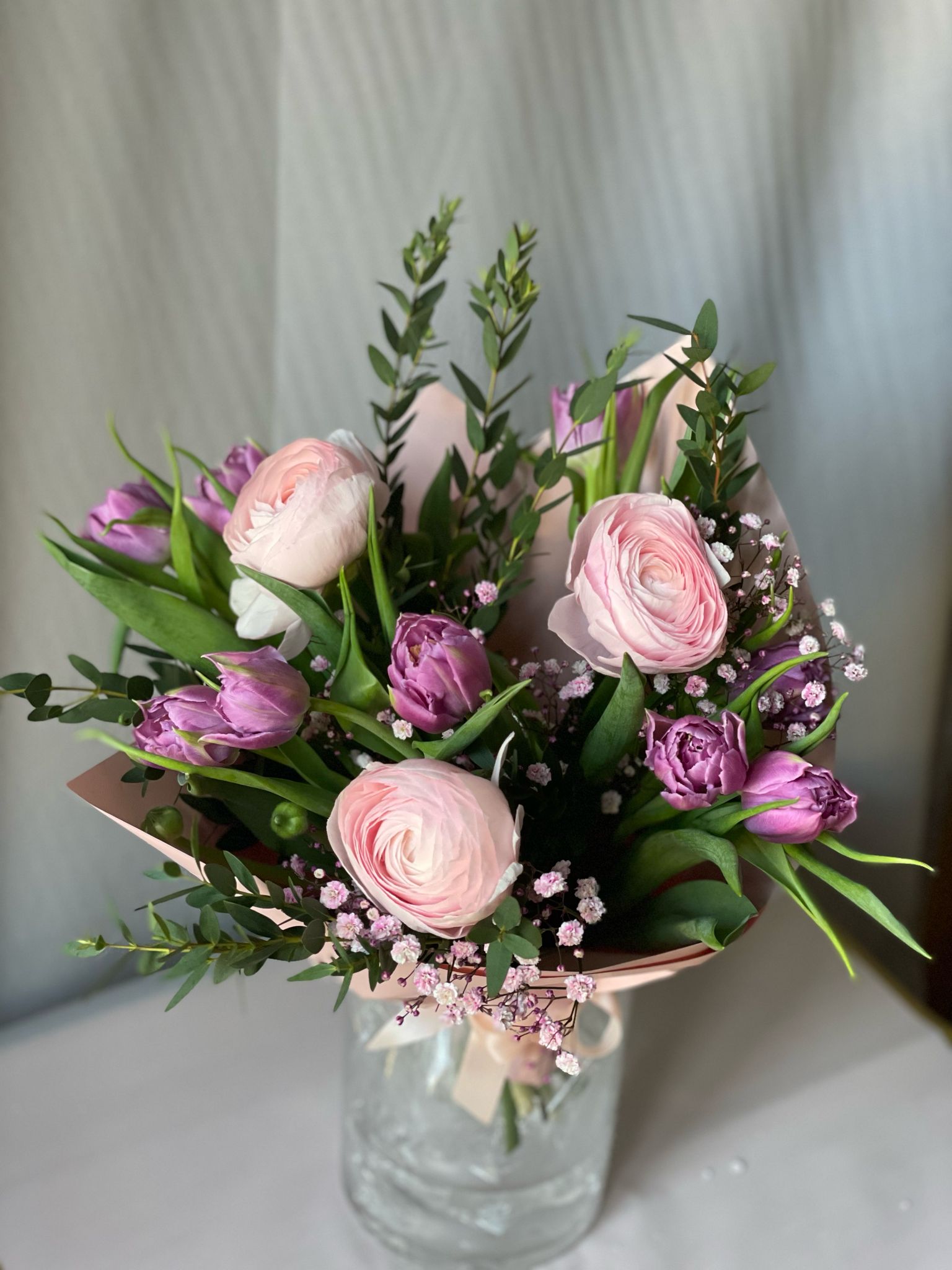 Букет цветов будет создан в стиле и цветовой гамме, представленной на фотографии. Если определенных цветов нет в наличии, флорист заменит их эквивалентными цветами из наличия, сохранив общий вид и атмосферу букета.